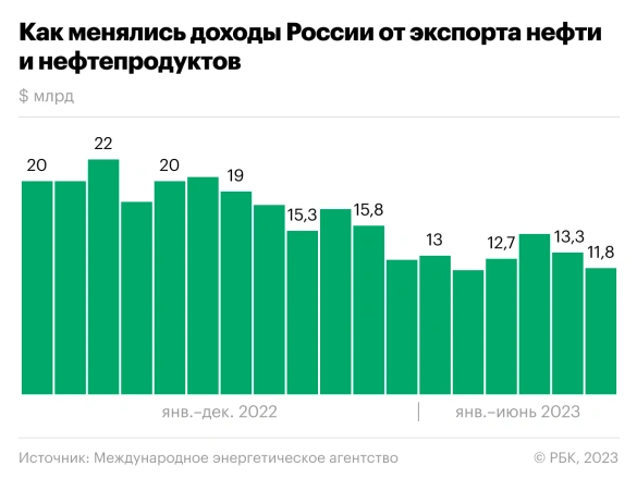 Доходы России от экспорта нефти и нефтепродуктов в июне 2023 года упали по сравнению с маем на $1,5 млрд, или на 11,2%, до $11,8 млрд, следует из обзора нефтяного рынка Международного энергетического агентства (МЭА), опубликованного 13 июля. Это самый низкий показатель за последние месяцы и почти вдвое меньше по сравнению с июнем 2022 года ($20,4 млрд), отмечает агентство.