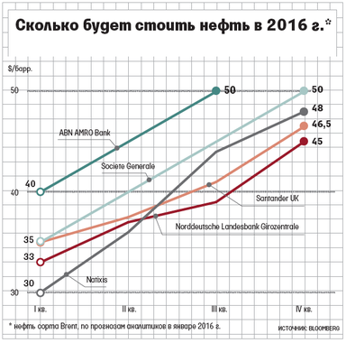 Пессимистичные прогнозы и у компаний. Сбербанк начал тестировать стрессовый сценарий с ценой в $25 за баррель Brent вместо прежних $30, рассказал во вторник президент банка Герман Греф. «В нашем бизнес-плане это [$30 за баррель Brent] был пессимистичный сценарий, а в начале года стал реальным», – пожаловался банкир. Впрочем, консенсус-цена, которую приводит Bloomberg, пока находится на уровне 2015 г. – $52,5 (см. график). «Мы считаем, что еще рано говорить о достижении дна», – написали в понедельник в отчете аналитики Bank of America Merrill Lynch.