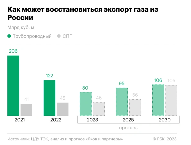 После обвала в 2022 году экспорт российского трубопроводного газа в этом году может снизиться еще — в 1,5 раза, до 80 млрд куб. м, прогнозирует «Яков и партнеры». Продажи могут не достичь докризисного уровня даже к 2030 году