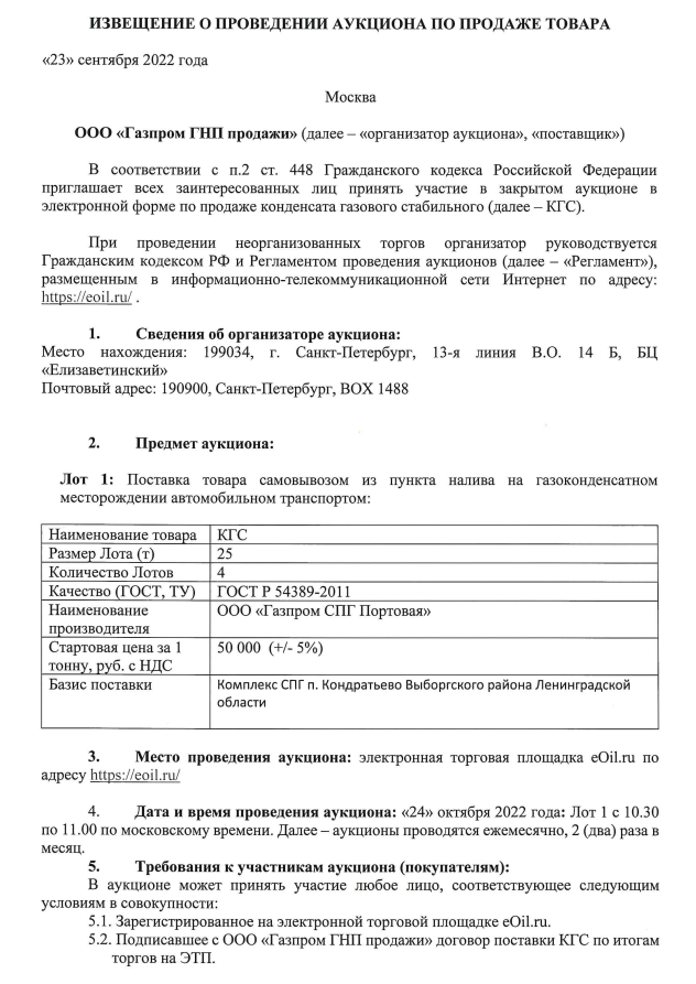 ООО «Газпром ГНП продажи» приглашает всех заинтересованных лиц принять участие в закрытом аукционе в электронной форме по продаже конденсата газового стабильного (далее – КГС). При проведении неорганизованных торгов организатор руководствуется Гражданским кодексом РФ и Регламентом проведения аукционов (далее – «Регламент»), размещенным в информационно-телекоммуникационной сети Интернет по адресу: https://eoil.ru/ .