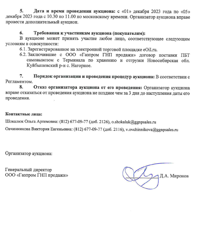 5. Дата и время проведения аукциона: с «01» декабря 2023 года по «05» декабря 2023 года с 10.30 по 11.00 по московскому времени. Организатор аукциона вправе провести дополнительный аукцион.