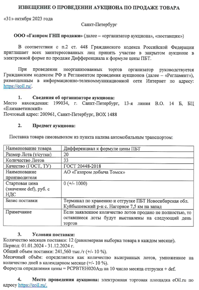 Торги начнутся на ЭТП eOil.ru с 1-го декабря 2023-го года.