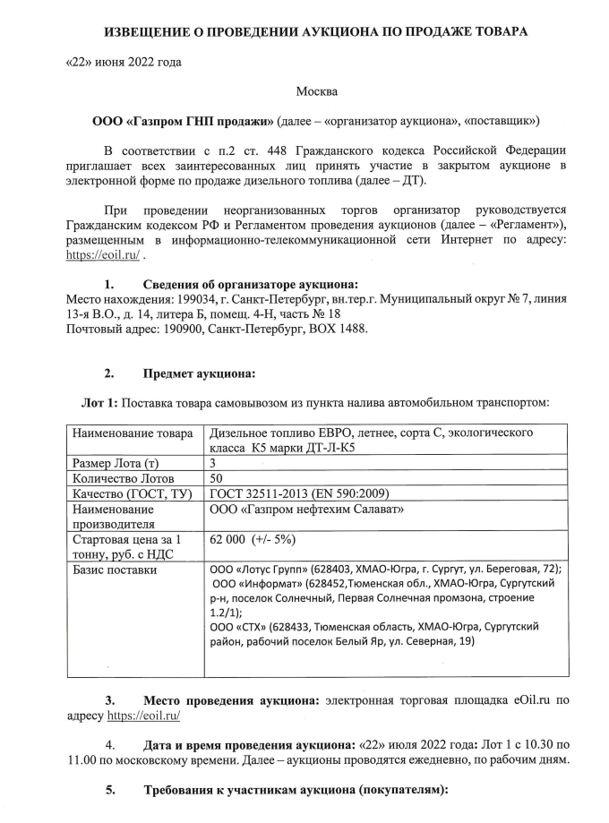 ГАЗПРОМ объявляет об аукционе по продаже дизельного топлива на площадке eOil