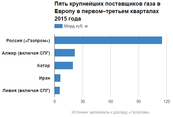 В материалах «Газпром экспорта» со ссылкой на данные Международного энергетического агентства, Евростата, национальных статистических агентств и агентства Bloomberg описываются и основные конкуренты по состоянию на октябрь 2015 года. Больше всех нарастили поставки в Европу Норвегия — с 82,4 млрд до 90,2 млрд куб. м (+9,4%), Катар — с 17,9 млрд до 19,9 млрд куб. м (+11%), Великобритания — с 30,6 млрд до 32,2 млрд куб. м (+5,2%).