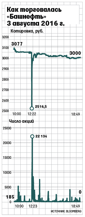 Слова Шувалова «Интерфакс» передал в 12.18 мск. Уже в 12.22 обыкновенные акции «Башнефти» рухнули на 17,68% до 2516,5 руб., но через две минуты вернулись к прежнему уровню. На закрытие торгов обыкновенные акции «Башнефти» подешевели на 1,8% до 3000 руб., привилегированные – на 1,8% до 1864,5 руб. за акцию. Индекс ММВБ вырос на 0,34%. Капитализация «Башнефти» упала на 3,1% до 443,5 млрд руб. ($6,6 млрд по курсу ЦБ). При этом количество сделок и обороты по торгам с бумагами «Башнефти» были выше, чем обычно. Всего через биржу прошло 171 393 акции (четверть из них была продана за три минуты с 12.20 до 12.22) на 511,88 млн руб., тогда как средний оборот торгов бумагами «Башнефти» за последние дни немногим превышал 300 млн руб.