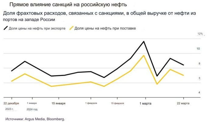 Умножив эти оценки за баррель на количество грузов на борту каждого класса используемых судов, можно получить представление о том, какова будет совокупная стоимость найма танкеров, связанная с санкциями. По данным Bloomberg, отслеживающего отдельные поставки, с конца декабря эта сумма составила 773 миллиона долларов.