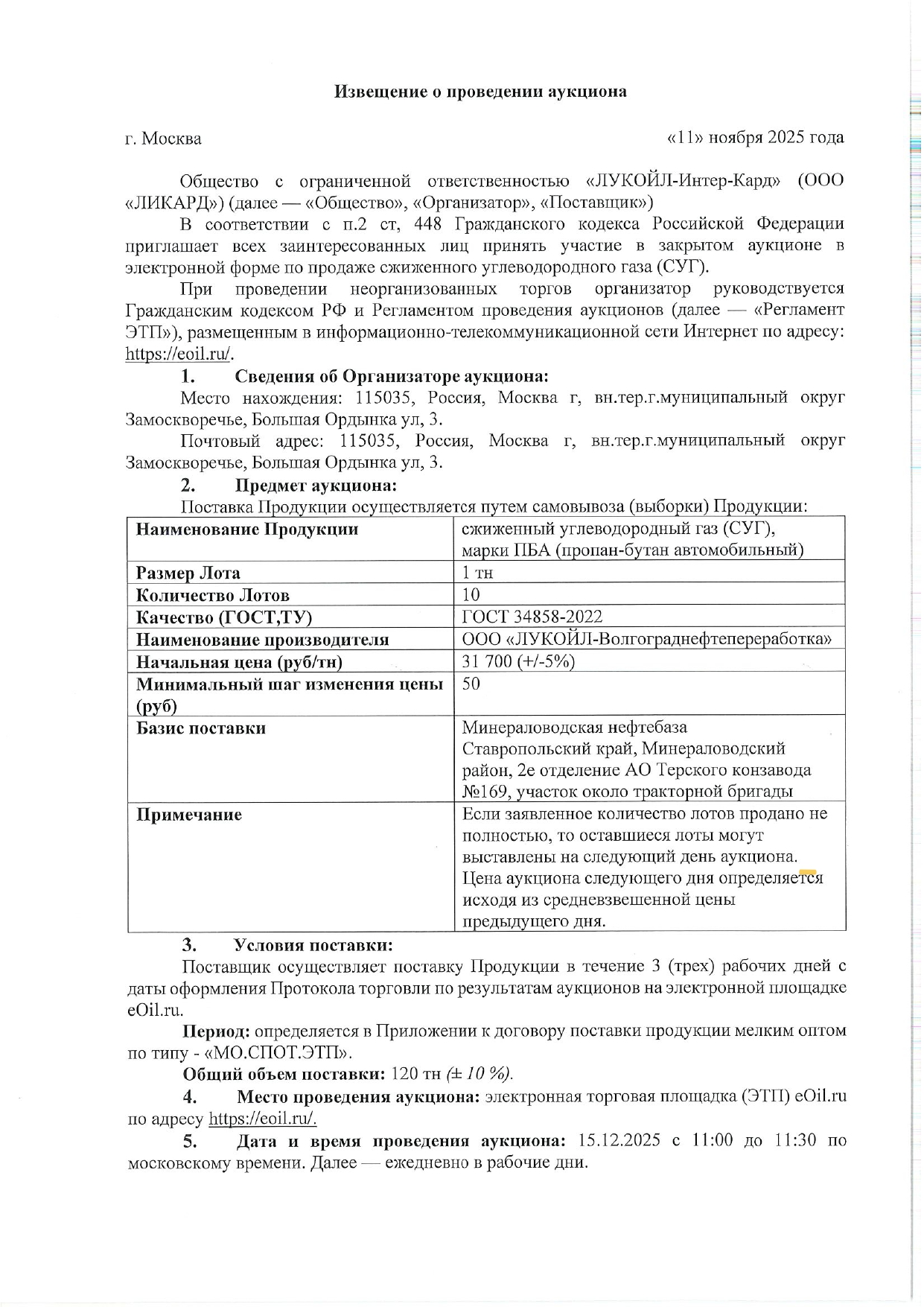 В соответствии с п.2 ст. 448 Гражданского кодекса Российской Федерации приглашает всех заинтересованных лиц принять участие в закрытом аукционе в электронной форме по продаже сжиженного углеводородного газа (СУГ).