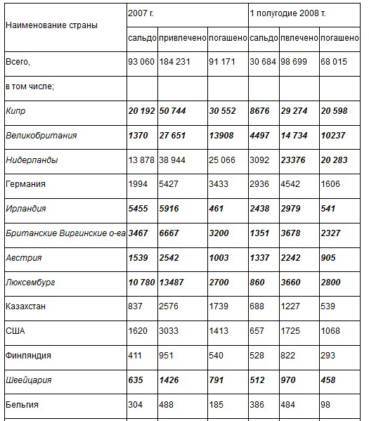 Как видно из данных таблицы, из 93 млрд долл., на которые в 2007 г. увеличилась задолженность нефинансовых бизнес-структур, почти 70 млрд долл. (около 3/4) приходится на оффшорные и спарринг-офшорные юрисдикции. Хотя темпы прироста задолженности в первом полугодии 2008 г. несколько замедлились, данная тенденция сохранилась. При этом, исходя из географии привлеченных в Россию средств по ссудам и займам из-за рубежа, обратный поток по их погашению будет связан с теми же офшорными и спарринг-офшорными юрисдикциями. Здесь возникают вопросы иного плана. Насколько вообще оправданно помогать из госрезервов компаниям, конечные бенефициары которых занимались минимизацией налогообложения с использованием офшоров и тем самым не содействовали в полной мере пополнению этих резервов?