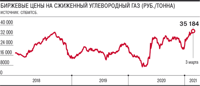 Цена сжиженных углеводородных газов на Санкт-Петербургской международной товарно-сырьевой бирже 3 марта достигла очередного исторического максимума в 35,2 тыс. руб. за тонну. Таким образом, с начала года стоимость СУГ увеличилась почти в 1,5 раза. Правительство постаралось сдержать рост биржевых цен, с 1 марта увеличив для производителей СУГ норматив их обязательных продаж на бирже до 7,5% от производства. Тем не менее с тех пор цена на сжиженные газы выросла еще на 2%.