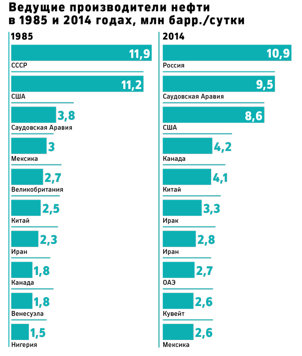 Принято считать, что обрушение цен на нефть в середине 1980-х было одной из главных причин падения Советского Союза. Как отмечал экономист Егор Гайдар, из-за обвала нефтяных цен СССР терял приблизительно $20 млрд в год, и без этих денег страна просто не могла выжить.