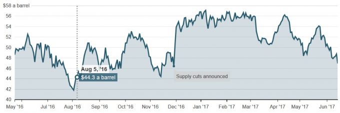 В среду Управление энергетической информацией США сообщило о неожиданном росте запасов бензина, что компенсировало падение цен на нефть. Это уже второй подряд отчет, который свидетельствует об увеличении запасов бензина. Данное обстоятельство повлекло снижение цены на Brent до $47 — это почти что уровень цен до объявления ОПЕК о намерении ограничить объемы добычи.