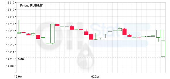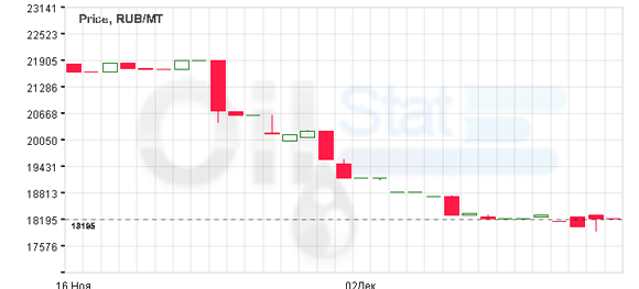 Спрос на бензины наоборот падает. По наблюдениям участников рынка из-за резкого похолодания многие автолюбители не смогли завести свои автомобили, и, соответственно, не заезжали на заправки. Погодные условия отражаются и на опте. 16 декабря на eOil.ru был всего один лот на покупку Аи-92 на Сахалин по 26000 руб. за тонну. Встречных предложений о продаже не обнаружилось. А индекс цен на базисе Черкассы был на уровне… 18 210 руб. за тонну.