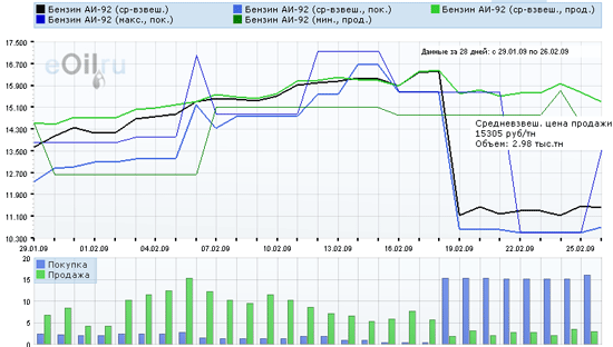 25 февраля на Торговой площадке eOil.ru стоимость бензина марки Аи-92 уменьшилась. Так, средневзвешенная цена продажи сократилась на 344 руб./т. и составила 15 305 руб. за тонну, объем предложения сократился на 0,5 тыс. тонн до отметки 2,98 тыс. тонн. Средневзвешенная цена покупки увеличилась на 187 руб./т. до уровня 10 687 руб. за тонну, объем спроса увеличился на 1 тыс. тонн и составил 15 тыс. тонн.