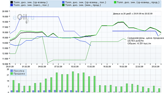 25 февраля на Торговой площадке eOil.ru стоимость дизтоплива зимнего значительно сократилась. Так, стоимость продажи упала на 588 руб./т. и составила 16 783 руб. за тонну, объем предложения уменьшился на 3,16 тыс. тонн и составил 4,59 тыс. тонн. Средневзвешенная цена покупки резко сократилась на 2 000 руб./т. до уровня 15 000 руб. за тонну при небольшом уменьшении объема спроса до отметки 0,3 тыс. тонн.