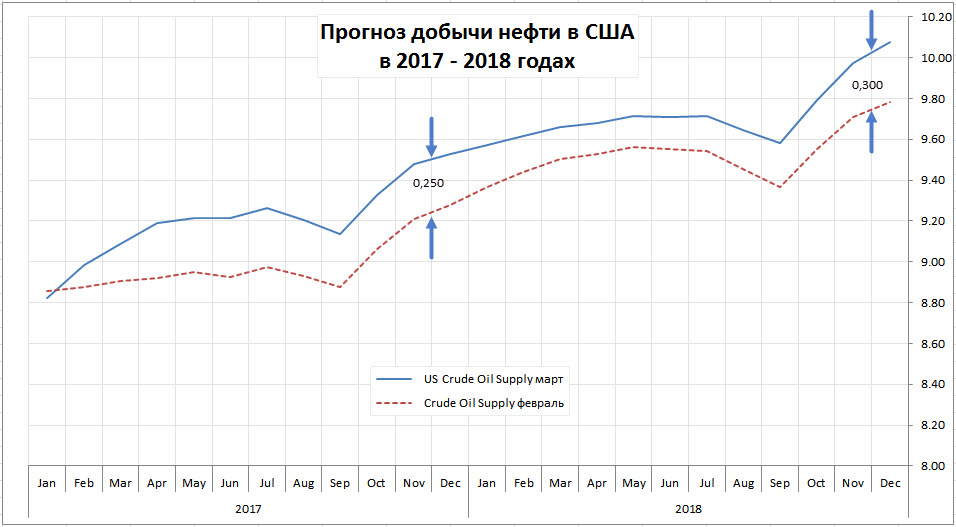При этом, как это часто бывает – слухи оказались несколько преувеличенными. Действительно, Агентство энергетической информации США в марте, по сравнению с февралем, существенно повысило прогноз по добыче нефти в США. Теперь, в декабре 2017 года, прогнозируется добыча нефти на уровне 9.53 млн баррелей в сутки, а не 9.28 млн баррелей, как это планировалось в еще месяц назад (рис.1).