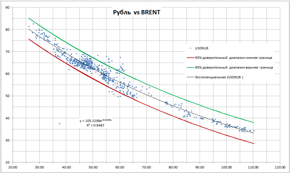 Экспоненциальная математическая модель (рис.3) предполагает, что при стоимости нефти BRENT $58, стоимость рубля составляет $57, так, что не о какой перекупленности рубля речи не идет, т.к. при такой цене рубль сбалансирован, и «carry trade» здесь ни при чем.