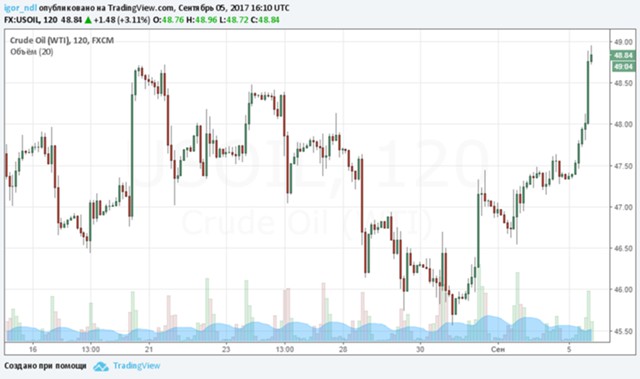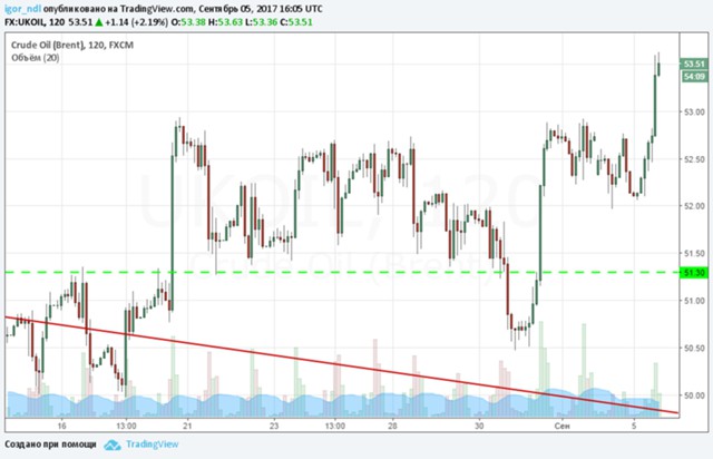 На графике видно, что цены наконец-то вышли из боковика. Теперь, возможно, мы увидим ретест уровня $52,80, а затем котировки продолжат свой рост. Кстати, американская WTI, которая в последнее время сильно отставала от североморской смеси, растет сегодня более чем на 3%. Формальным поводом для ралли стало сообщение о запуске некоторых НПЗ, которые были остановлены после урагана в Техасе.