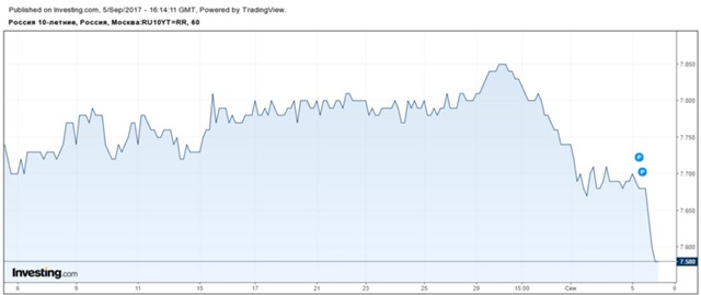 На этом фоне ралли наблюдалось и на долговом рынке РФ. Доходности десятилетних облигаций опустились ниже 7,6%, а пятилетних — до 7,65%