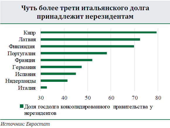 Доля нерезидентов на рынке ОФЗ составляет сейчас 30%. Как обстоят с долей нерезидентов в консолидированном госдолге в еврозоне? Во всех странах эта доля выше 30% (см. график). Причём разброс очень большой: от 79% у Кипра до 33% в Италии. В последней, как мы неоднократно отмечали, эффект предпочтения отечественных финансовых инструментов (home bias) традиционно высок. Кроме того, продолжается отток капитала: баланс Target2 (счёт итальянского ЦБ в ЕЦБ) в апреле достиг уже 24%ВВП.