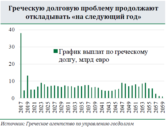 На прошедшей неделе Еврокомиссия перечислила Греции €8,5 млрд, 7 из которых будет потрачено на выплаты по госдолгу в июле. Кроме того, она выпустила пресс-релиз, в котором пообещала частичное списание долга. На совершенно фантастических условиях: поддержание 3,5%ВВП первичного профицита бюджета до 2022 года и около 2%ВВП до 2060-го. Нам не известен ни один аналитик за пределами Еврокомиссии, которому эти предложенные условия казались бы хоть отдаленно реалистичными.