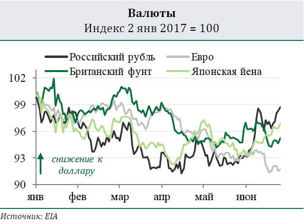 Цены на нефть продолжили восстановление, но со среды их волатильность значительно выросла. Urals к пятнице $45,8/барр., что почти не отличается от значения неделей ранее. Статистика EIA оказала неоднозначное влияние на настроения инвесторов. Так, позитивным сигналом для цен стало сокращение запасов нефти (-6,3 млн барр.), бензина (-3,7 млн барр.) и дистиллятов (-1,8 млн барр.). Это наибольшее сокращение запасов углеводородов в США с сентября 2016г. В то же время, инвесторов расстроил рост добычи в США (+88 тыс. барр./сутки). Напомним, что неделей ранее производство в США упало на 100 тыс.барр./сутки в связи с погодой в Мексиканском заливе и ремонтом мощностей на Аляске. Вероятно, нынешняя динамика запасов и производства связана с восстановлением работы мощностей. На цены повлиял и отказ России снизить производство в рамках ОПЕК+. Также, инвесторы негативно восприняли рост экспорта ОПЕК до 25,9 млн барр. по итогам июня. На рынке сохраняется неопределённость.