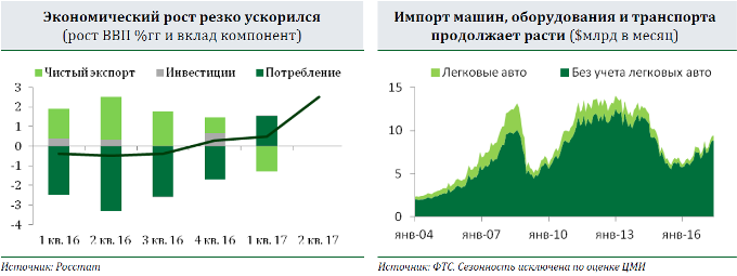 Вклад чистого экспорта в рост, на наш взгляд – отрицательный. При этом быстро растёт производство (5,6%гг) и импорт (16,7%гг за янв-май) инвестиционных товаров, а также товаров длительного пользования (в июне: холодильники 8,5%гг, стиральные машины 23,4%гг, легковые автомобили 16,9%гг). А реальные зарплаты во 2кв выросли на 3,1%гг. Именно в этом расхождении – росте реальных зарплат и доходов – мы видим основную причину «неожиданности» ускорения ВВП во 2кв. Получающие зарплату россияне активно восстанавливают потребление: выросли продажи непродовольственных товаров на 1,9%гг. А зависимые от консолидируемого бюджета россияне всё ещё потребление снижают: продажи продовольственных товаров снизились на 0,6%гг. Теперь посткризисное восстановление будет выглядеть так. Наш прогноз роста экономики в 2017 год будет повышен с текущих 1,2%.