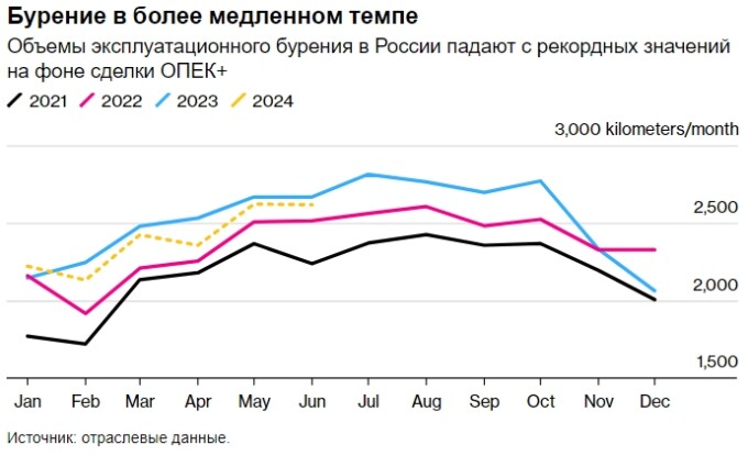 Бурение в первой половине 2024 года снизилось на 2,5% по сравнению с уровнем годом ранее. В этом году Россия усилила сокращение добычи в рамках ОПЕК+