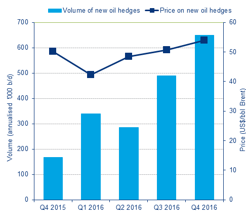 В связи с тем, что ОПЕК и страны, не входящие в ОПЕК, заключили соглашение о снижении объемов добычи нефти на 1.8 млн. б/д до конца первой половины 2017 года, цены на нефть подскочили до уровня, превышающего $50 за баррель. Однако, рост цен не только повысил доходность американских нефтяных компаний, но и предоставил им возможность для хеджирования.