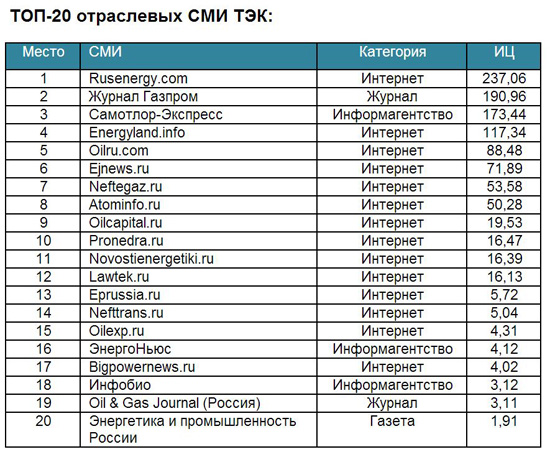 В рейтинг вошли медиаресурсы отрасли ТЭК. Основой для построения рейтингов стал Индекс Цитируемости (ИЦ) «Медиалогии».
