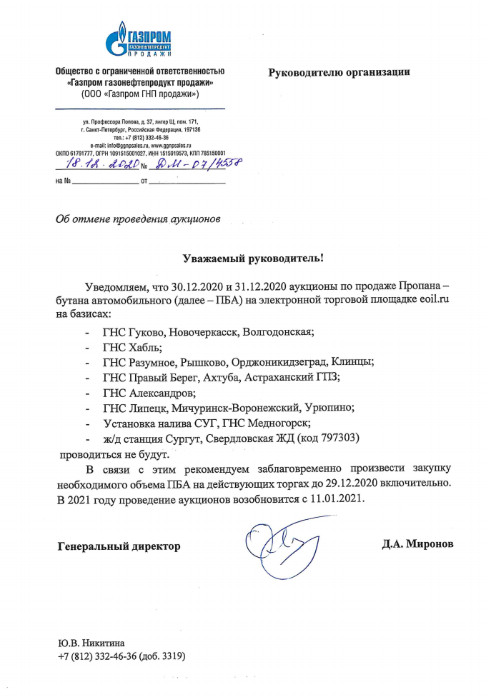 ООО «Газпром ГНП продажи» уведомляет, что 30.12.2020 и 31.12.2020 аукционы по продаже пропана-бутана автомобильного (ПБА) на электронной торговой площадке eOil.ru не будут проводиться на следующих базисах: