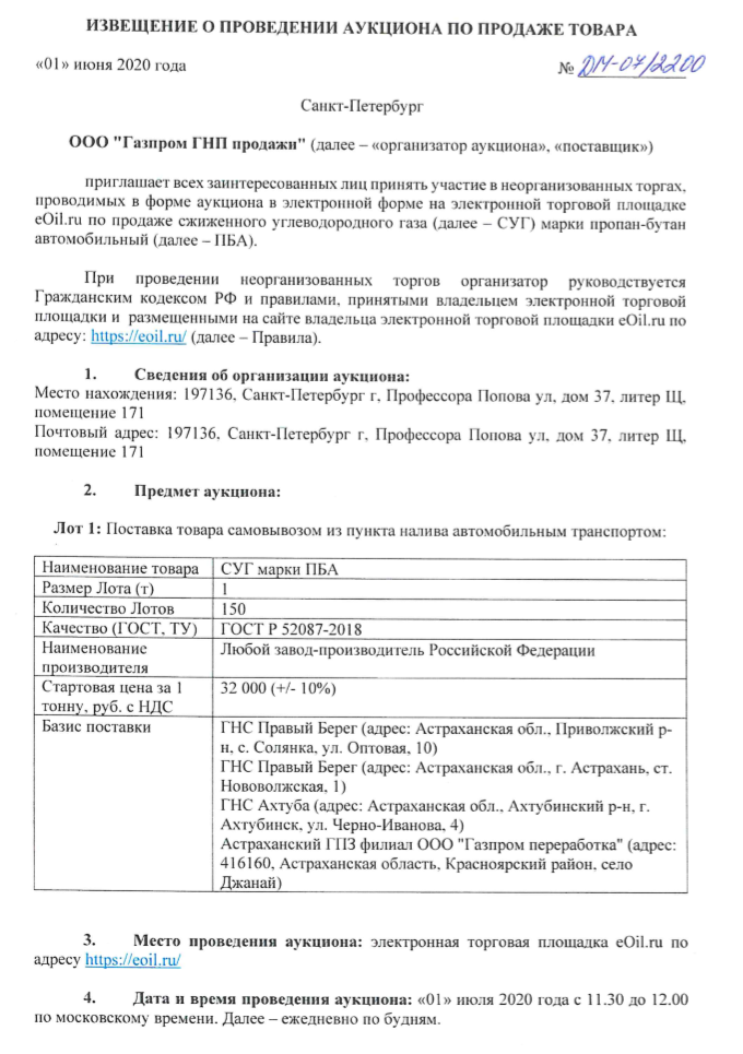ООО «Газпром ГНП продажи» (далее – «организатор аукциона», «поставщик») приглашает всех заинтересованных лиц принять участие в неорганизованных торгах, проводимых в форме аукциона в электронной форме на электронной торговой площадке eOil.ru по продаже сжиженного углеводородного газа (далее – СУГ) марки пропан-бутан автомобильный (далее — ПБА).