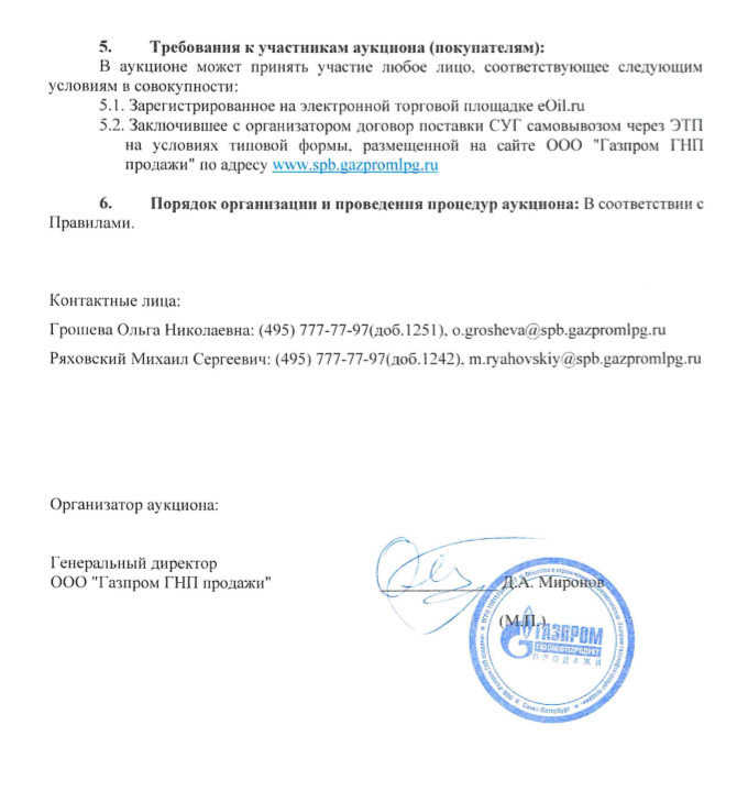 5.2. Заключившее с организатором договор поставки СУГ самовывозом через ЭТП на условиях типовой формы, размещенной на сайте ООО «Газпром ГНП продажи» по адресу www.spb.gazpromlpg.ru.