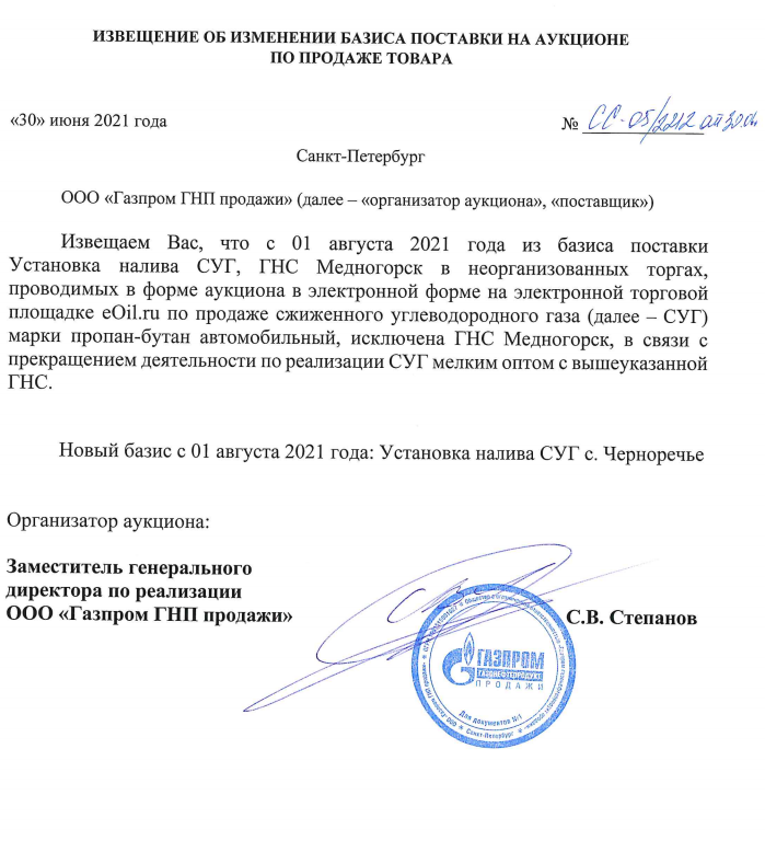 ООО «Газпром ГНП продажи» сообщает, что с 1 августа 2021 года из базиса поставки в торгах проходящих на ЭТП eOil.ru исключается ГНС Медногорск в связи с прекращением деятельности по реализации СУГ пропан-бутан автомобильный мелким оптом.