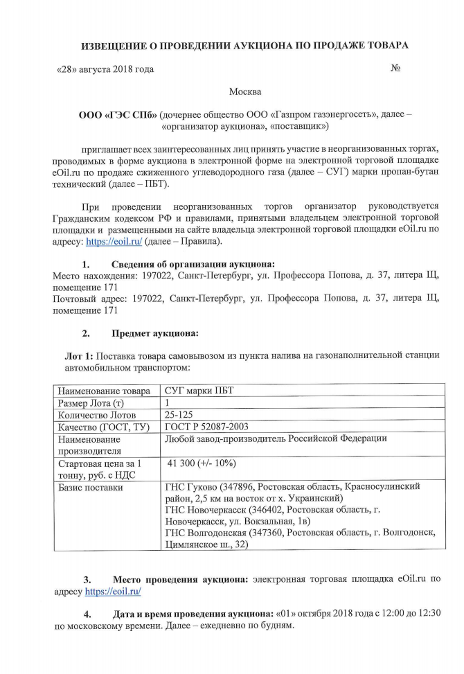 ООО «ГЭС СПб» приглашает всех заинтересованных лиц принять участие в торгах, проводимых в форме аукциона в электронной форме на электронной торговой площадке eOil.ru по продаже сжиженного углеводородного газа марки пропан-бутан технический.