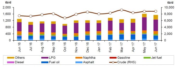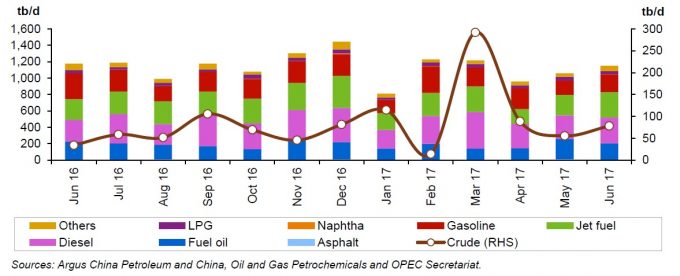 В июне экспорт нефти в Китае установился на уровне 78 tb/d. Показатель экспорта нефтепродуктов в Китае в июне увеличился на 92 tb/d по сравнению со значениями предшествующего месяца.