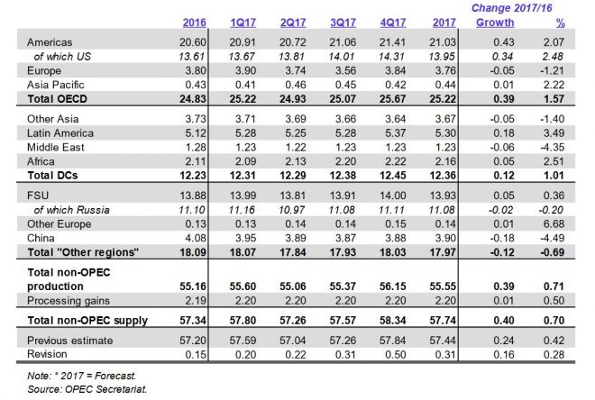Прогнозируется, что в 2017 году предложение в странах, не являющихся членами ОПЕК, возрастет на 0.40 mb/d до показателя 57.74 mb/d. Этот прогноз обусловлен, в основном, увеличением объемов добычи нефтеносных песков в Канаде и общим увеличением объемов добычи нефти в США.