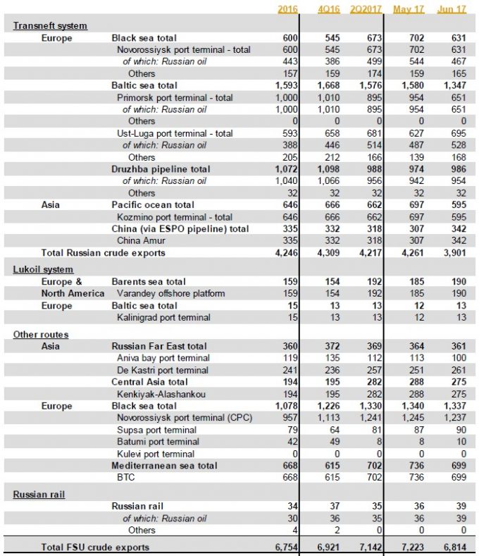 В июне общий показатель экспорта в странах бывшего СССР упал на 408 tb/d или 6% и установился на уровне 6.8 mb/d. Показатель экспорта в России также сократился на 360 tb/d или 9% до значения 3.9 mb/d. Общий объем поставок из региона Черного моря сократился на 71 tb/d или 10% до среднего значения 631 tb/d.