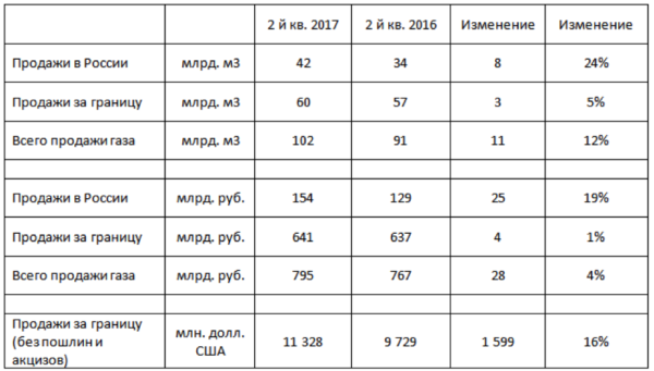 Добыча газа во втором квартале 2017 года по сравнению со вторым кварталом 2016 года значительно выросла — с 84 млрд. кубометров до 106 млрд. — на 26%. Увеличились, соответственно, и продажи. Этот важный показатель требует более подробной информации, которую сведем в следующую таблицу: