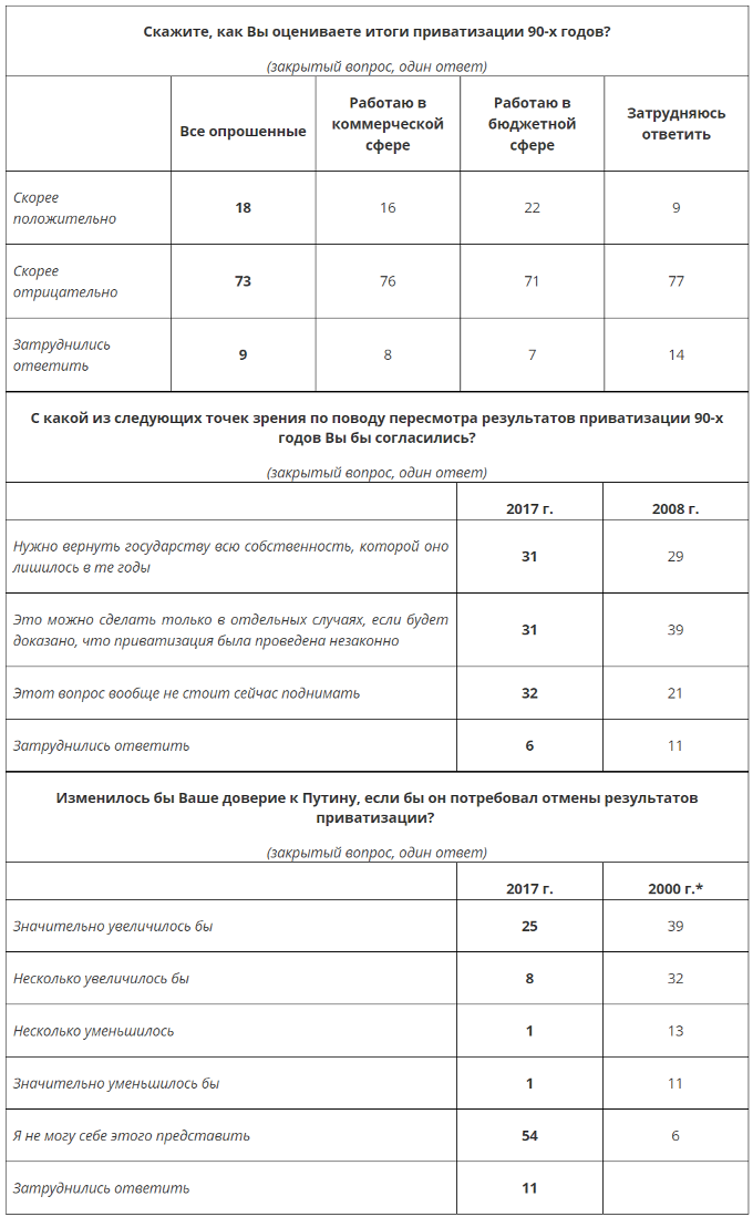 Прошло уже 25 лет с начала приватизации в России, и спустя это время 73% россиян уверены в негативном характере итогов этого процесса, свидетельствуют данные Всероссийского центра изучения общественного мнения (ВЦИОМ).