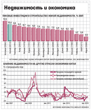 Строительный бум подпитывал и другие отрасли: так, динамика продаж автомобилей следует за динамикой продаж на рынке недвижимости (см. график). Аналогичная связь и с кредитами: по оценке McKinsey, почти половина долгов связана с этим сектором.