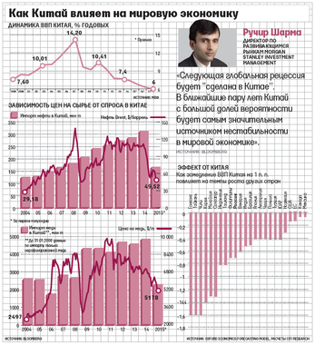 Замедление Китая уже оказывает заметное влияние на различные секторы мировой экономики, объемы международной торговли и цены на сырьевые товары. Если в 1999 г. размер ВВП Китая, по данным МВФ, превысил $1 трлн, то в 2014-м – $10 трлн. Стране со стремительно урбанизировавшимся населением нужно было все больше металлов, энергоресурсов и продовольствия. По оценкам Citi, доля закупок Китая в совокупном мировом экспорте нефти составила в 2013 г. почти 40%, меди – более 50%, железной руды и соевых бобов – более 70%. Быстро возраставшие потребности Китая, за которыми не поспевало предложение, способствовали повышению цен на сырье. Но в последние годы спрос стал снижаться. Так, если годовой импорт нефти в 2005–2010 гг. вырос почти вдвое, то с 2010 по 2014 г. – лишь на 29%. При этом мировая добыча заметно увеличилась, прежде всего за счет сланцевого бума в США, что привело к появлению избытка нефти.