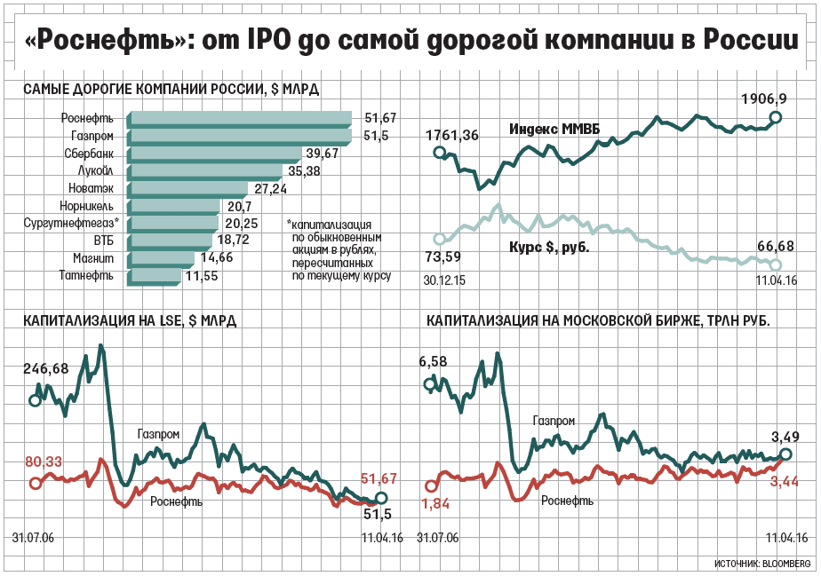 Среди лидеров «Роснефть»: вчера она прибавила 2,69% на Московской бирже и 4,21% на Лондонской (LSE) (см. инфографику) и стала самой дорогой компанией страны: на обеих площадках она обгоняла по капитализации «Газпром». К концу дня на Московской бирже «Газпром» снова опередил «Роснефть», но на LSE дороже оставалась «Роснефть».
