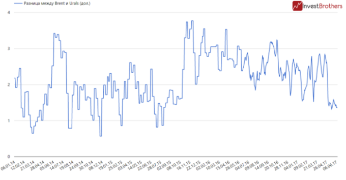 На протяжении периода с августа 2015 г. по август 2016 г. средняя разница между Brent и Urals держалась на уровне в 2,6 долларов, однако начиная с конца прошлого лета этот показатель опустился ниже 2,3 долларов, а в последние 2 месяца он и вовсе сократился до 1,45 долларов.
