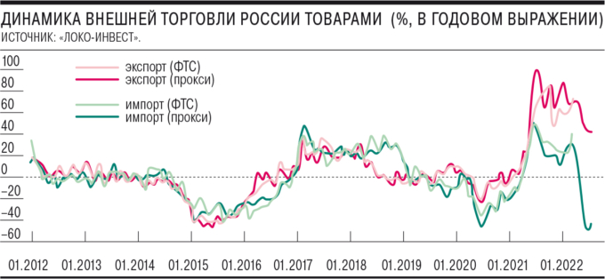 В теории потребительский импорт может (при достаточно сильном рубле и при нормализации логистики, мощности которой в РФ сейчас, видимо, даже избыточны) не только восстановиться до докризисных значений, но даже несколько перекрыть потери от обвала инвестиционного импорта, который ограничен санкциями ЕС, США, Японии и Канады. При этом экспорт из РФ в денежном выражении непредсказуем: то, что дисконт на поставки российской нефти и нефтепродуктов будет расти,— спорный тезис, а фактические цены поставок, видимо, будут держаться в тайне.