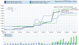 Наиболее значительный рост цен, среди высокооктановых бензинов продемонстрировал бензин марки Аи-92. Средняя цена на этот вид моторного топлива за отчетный период времени увеличилась на 2084 руб./т, что соответствует 14,90%, и составила 16071 руб./т. Высокооктановый бензин марки Аи-95 был скорректирован в положительную сторону на 1183 руб./т или 7,18%. Средняя стоимость данного вида моторного топлива составила 17663 руб./т. Процентное изменение низкооктанового бензина марки А-76/80 составило 12,22%, что соответствует 1493 руб./т в денежном эквиваленте. Авиационное топливо не намного повысилось в цене. В среднем повышение составило 293 руб. т или 1,62%.
