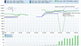 4 февраля на Торговой площадке eOil.ru стоимость дизтоплива летнего незначительно выросла. Так, стоимость продажи увеличилась на 42 руб./т. и составила 12 942 руб. за тонну, объем предложения сократился на 0,55 тыс. тонн до отметки 170,31 тыс. тонн. Средневзвешенная цена покупки выросла на 112 руб./т. до уровня 13 079 руб. за тонну при увеличении объема спроса на 0,18 тыс. тонн до отметки 3,28 тыс. тонн.