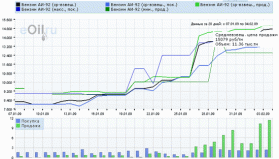 Динамика цен в крупнооптовом секторе российского рынка нефтепродуктов продолжает движение вверх. В начале нового месяца компании снова произвели значительную положительную коррекцию своих отпускных цен. Наибольшим изменениям подверглись снова такие виды топлива, как высокооктановый бензин марки Аи-92 и дизельное топливо зимнее. Тот факт, что летнее дизтопливо на этой неделе показало не такое заметное повышение средних цен, обусловлен с ростом спроса на зимний сорт топлива в связи с похолоданием во многих регионах. Также продолжает наблюдаться дефицит продукции, дополнительно стимулирующий рынок повышению цен.