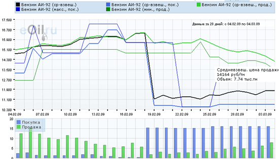 3 марта на Торговой площадке eOil.ru стоимость бензина марки Аи-92 значительно уменьшилась. Так, средневзвешенная цена продажи сократилась на 428 руб./т. и составила 14 164 руб. за тонну, объем предложения увеличился на 1,48 тыс. тонн до отметки 7,74 тыс. тонн. Средневзвешенная цена покупки осталась на прежнем уровне 10 687 руб. за тонну при стабильном объеме спроса 16 тыс. тонн.