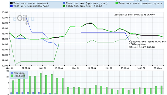 3 марта на Торговой площадке eOil.ru стоимость дизтоплива зимнего заметно снизилась. Стоимость продажи уменьшилась на 391 руб./т. и составила 16 094 руб. за тонну, объем предложения увеличился на 0,98 тыс. тонн и составил 10,27 тыс. тонн. Средневзвешенная цена покупки не изменилась и сохранилась на уровне 15 000 руб. за тонну при стабильном объеме спроса 0,3 тыс. тонн.