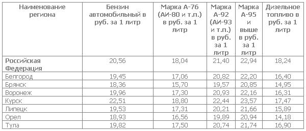 Увеличение средних цен на бензин к указанной дате зарегистрировано в 46 центрах субъектов Российской Федерации, из них в восьми центрах прирост цен на бензин составил 2,0% и более. В 30 центрах субъектов Федерации цены на бензин остались на уровне предыдущей недели. Удешевление бензина было зафиксировано в семи городах. В Москве и Санкт-Петербурге бензин в среднем за неделю подорожал на 0,9% и 2,5% соответственно.